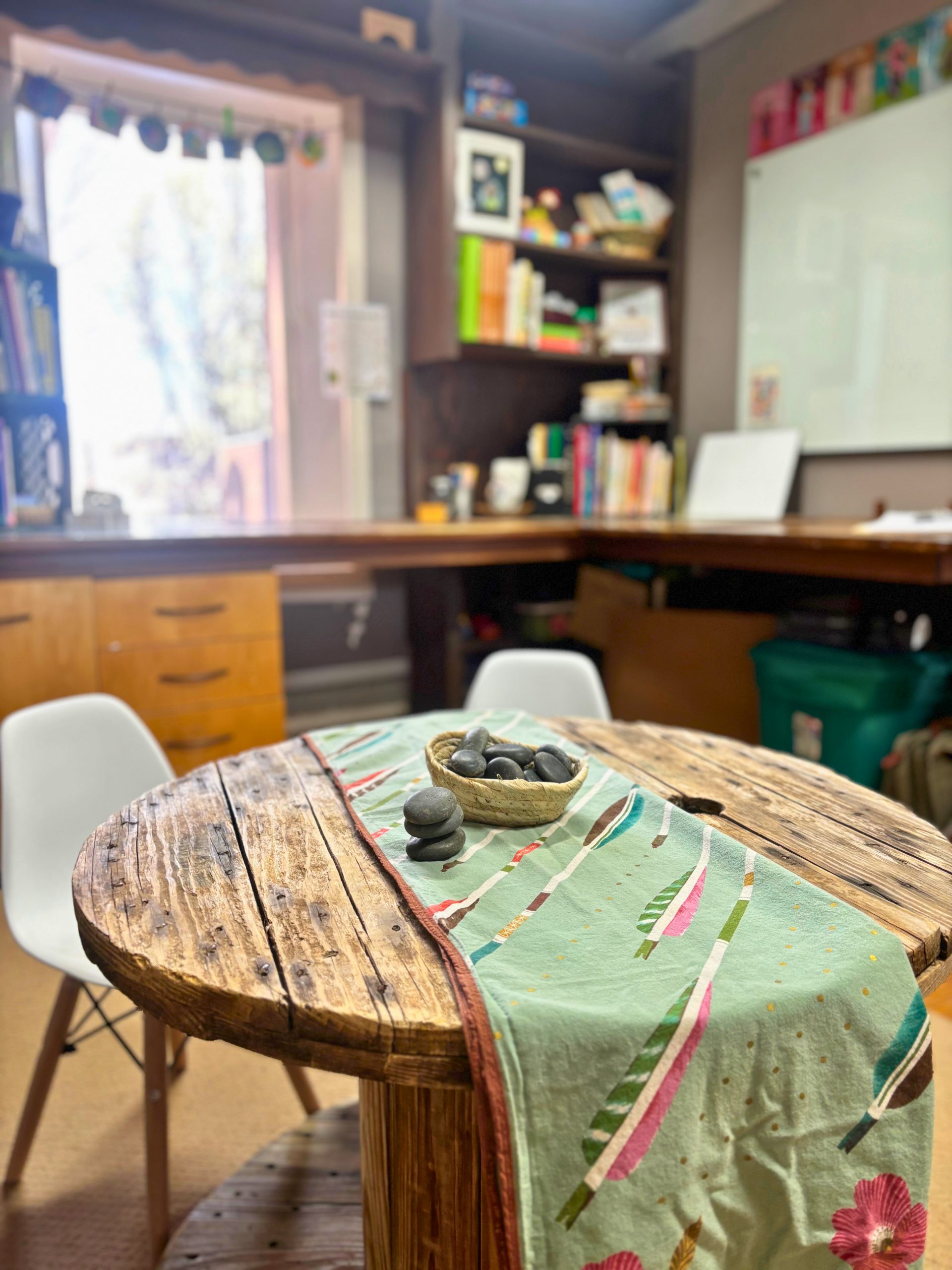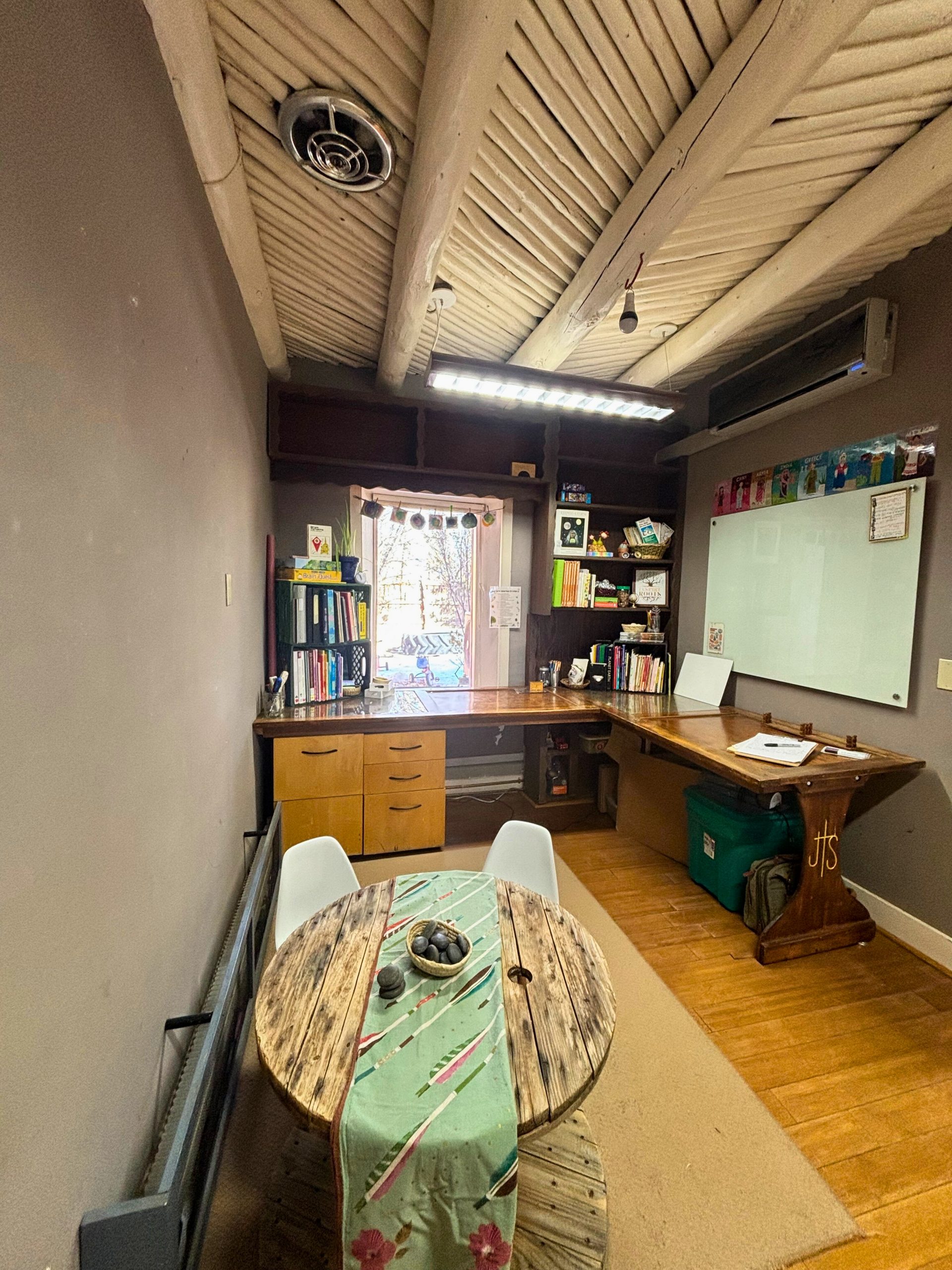 A serene, sun-lit literary retreat space at Inspire Roots— dedicated to independent [or small group] journaling of daily thoughts, wonders and feelings, deep dives into research sparked by personal curiosities, reflective writing, idea sketching, or simply just sitting in quiet contemplation—allowing thoughts to unfold and creativity to flow [at its own pace].